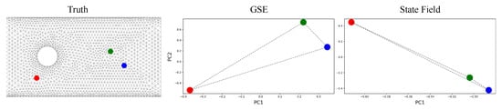 Comparison of relative positions of nodes in the cylinder flow (). The state field does not preserve the relative positions of nodes in the two-dimensional latent subspace, whereas GSE is capable of learning the relative positions between nodes. The encoded nodes in the two-dimensional latent subspace of GSE closely resemble the actual scenario.