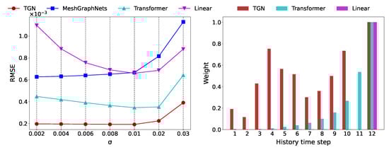 For airfoil flow, we add random noise to both velocity and density, which obey Gaussian distributions and , respectively. For ease of representation, we let . Figure A1 illustrates the variation in the average prediction error with noise and the weight distribution of the model. As can be seen in Figure A1 (left), the shorter history time steps affect the performance of the sequence models, resulting in similar errors for the sequence model and the next-step model. It is difficult to extract useful periodicity and trend information from shorter time series. In this case, the accuracy of the forecast depends on the most recent time step. As can be seen from the weight distribution in Figure A1 (right), our model assigns the maximum weight to the most recent time step and lower weights to the previous time steps. This suggests that TGN can adjust the weight distribution to capture the most useful temporal information.