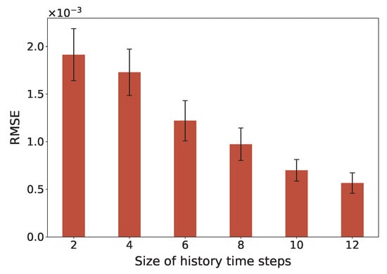 The averaged error of our model with different sized history time steps on the cylinder flow.