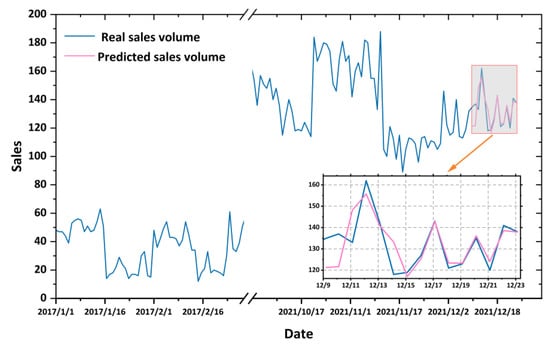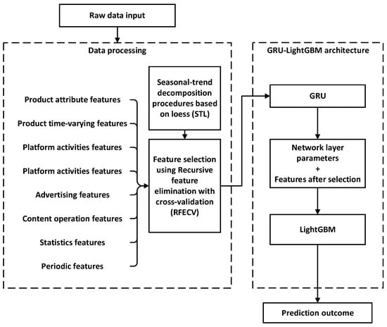 In recent years, e-commerce has entered a new stage of rapid expansion [1,2,3]. The development and prosperity of e-commerce mean that it has replaced and eliminated many offline stores. Sales prediction is important to e-commerce. Accurate sales prediction has great significance for enterprises in the coordination of production, procurement, and logistics. Many sales prediction issues are associated with time series prediction. The traditional sales prediction methods are, for example, the parameter prediction method and the Autoregressive Integrated Moving Average (ARIMA) method [4,5]. Machine learning methods such as Gradient-Boosted Regression Trees (GBRT), Light Gradient Boosting Machine (LightGBM), and Extreme Gradient Boosting (XGBoost) are also used [6,7,8]. Traditional methods are mainly developed for offline retailers, and the sales are affected by the weather, season, policies, and passenger flow volume. In contrast, e-commerce sales are mainly associated with activities on e-commerce platforms and network hot spots. For example, the emergence of the COVID-19 pandemic accelerated the process of the decline of traditional offline retailing [9], but e-commerce platforms such as Taobao and Amazon still had large numbers of sales. Hence, there is a specific need to develop sales prediction methods for e-commerce.