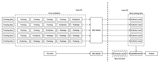 The structure of the GRU-LightGBM model is shown in Figure 5. The model consists of two layers. In Layer 01, the training data are evenly divided into five parts; four parts are used for training, and the remaining part of the data is used for prediction. The cross-validation method with one part reserved is used to train the GRU model. After the training, the GRU model is used for prediction. Then, we combine the five prediction results to obtain new training data for the LightGBM model in Layer 02. Driven by the model stacking approach [49], in the harmonization process, the results of predictions on the first layer are treated as new training data for the LightGBM model in the second layer. The feeding test data for the LightGBM model are the prediction results of the GRM model.