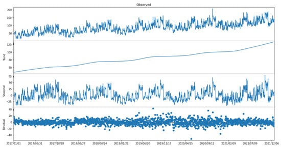 STL is used to analyze the fluctuations of the data. Various time series are handled using the STL method [35,36]. The STL method decomposes time series data into variation components, including seasonality, trends, and residuals, as shown using Equation (1) [37].