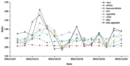 Comparison of sales prediction results by different algorithms.