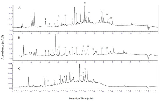 HPLC chromatograms of three extraction methods; (A) low-frequency ultrasound solvent extraction; (B) supercritical CO2 extraction, (C) microwave-assisted extraction. Peaks: (1) hydroxytyrosol, (2) 3,4-hydroxybenzoic acid, (3) tyrosol, (4) catechin, (5) 4-hydroxybenzoic acid, (6) coffee acid, (7) p-coumaric acid, (8) t-ferulic acid, (9) o-coumaric acid, (10) oleuropein, (11) oleuropein aglycone, (12) pinoresinol, (13) luteolin, (14) apigenin, (15) kaempferol.