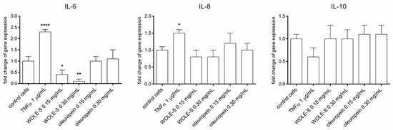 Analysis of IL-6, IL-8, and IL-10 expression in A549 cells treated for 2 h with WOLE-S and oleuropein. Statistically significant results were denoted with asterisks (* for p < 0.05, ** for p < 0.01, **** for p < 0.0001).