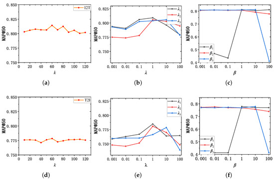 This section, we conduct an analysis of the sensitivity of all hyperparameters used in the model: . To explore the comprehensive impact of them, the accuracy of I2T and T2I task is used to visualize the trend of cross-modal hash performance. All these analysis are carried out in 16 bit hash code length on NUS-WIDE dataset.