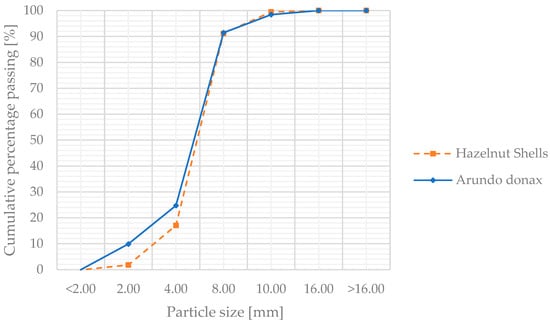 Giant reed (Arundo donax L.) and hazelnut shells were selected as bio-aggregates, characterized, and prepared as described in past studies [,,]. A. donax was harvested from the cultivation of the Department of Agricultural and Food Sciences, the University of Bologna, in Ozzano dell’Emilia, Bologna, Italy. Hazelnut shells were provided by Raccolti di Cin, Baldissero d’Alba, Cuneo, Italy. Both were shredded to have grain sizes mainly between 4 mm and 8 mm and dried at T = 60 °C until reaching a constant mass (with a variation in mass of ≤0.1% after 24 h) [,].