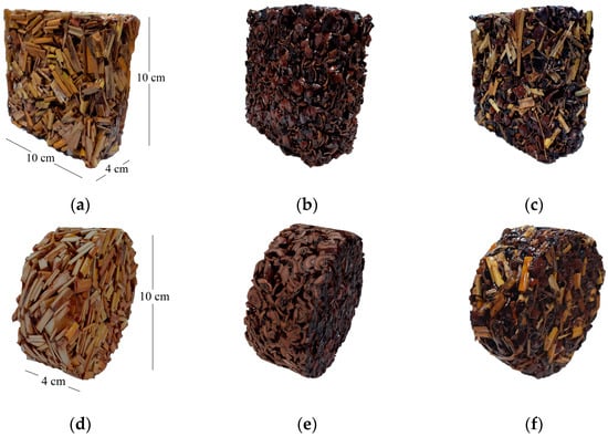 Composite samples made of bio-aggregates and sodium silicate solution. Rectangular and cylindrical samples: (a,d) A. donax-based composite—A; (b,e) hazelnut-shell-based composite—H; and (c,f) A. donax + hazelnut-shell-based composite—AH.
