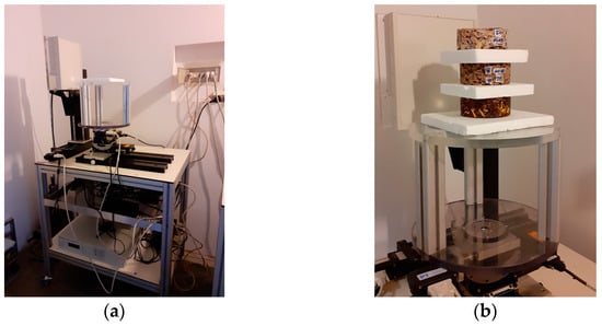Two or three samples, separated with expanded polystyrene boards (which are transparent to X-rays), were placed vertically on the rotation platform, one on top of the other (Figure 3b), to optimize the scanning time. A standard scanning protocol for the system was used: 900 projections over a 360-degree angle; a 4-frame average for each projection; and low magnification (M = 1.115). The voltage (70 kV), current (6.5 mA), and detector frame rate (3 fps) were chosen according to the sample size and material after an initial evaluation of the X-ray absorption and signal outcome in the detector. No filtration was used. The overall scanning time was 1 h.