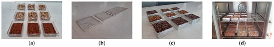 The bio-aggregates were placed in plastic boxes with open-top surfaces and filled up to a height of 2 cm (Figure 4a), as described by Cintura et al. []. This ensured the exposure of only one sample face (15 cm × 11 cm). Three replicates of each bio-aggregate were tested (AA1, AA2, and AA3; HH1, HH2, and HH3) as well as the mixture of 50% A. donax and 50% hazelnut shells (AAHH1, AAHH2, and AAHH3).