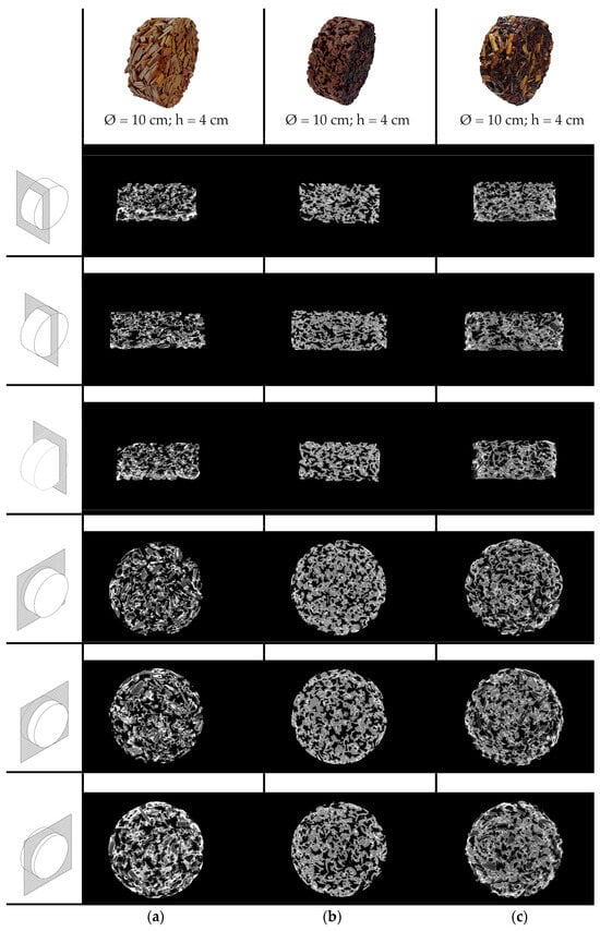 It is important to underline that although the samples employed for the tomography were not the same as those employed for the hygroscopic analysis (described in the following Section 3.3), the results were considered significant to carry out a comparison between the internal structures and hygroscopicity as all the samples were produced at the same time with the same mixtures of the aggregate–adhesive, production process, and conditions.
