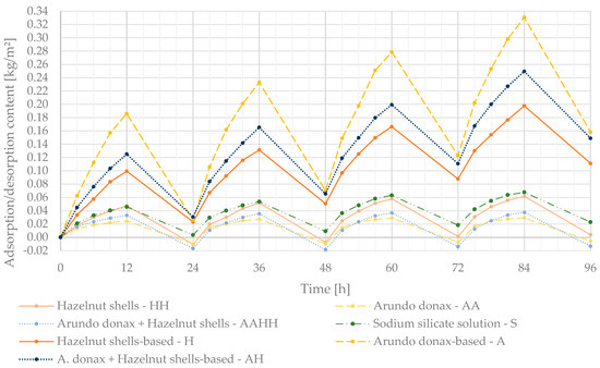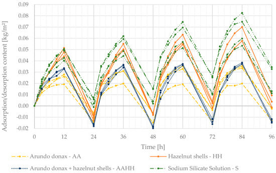 Figure 6 shows the moisture adsorption/desorption content curves of the materials for four adsorption/desorption cycles. Three samples for each aggregate (i.e., three samples of A. donax (AA), three of hazelnut shells (HH), and three of the mixture of A. donax and hazelnut shells (AAHH)), and four samples of sodium silicate (S) were considered and reported. To provide a clearer representation, the same color and style of lines were considered for the same tested material.