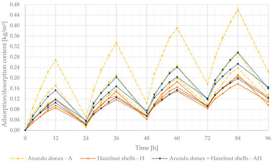 Figure 7 shows the moisture adsorption/desorption content curves during the four cycles for the composite samples (i.e., three samples of the A. donax-based composite (A), three of the hazelnut-shell-based one (H), and three of the mixture-based one (AH)). Again, the same color and style of lines were considered for the samples of the same composite.