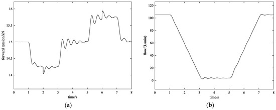 Assuming that forward slip Sh = 0.04 and backward slip SH = 0.4, the tension control results obtained using the proposed method are shown in Figure 15. Even though the values for forward and backward slip have changed greatly, the tension control effect maintains high accuracy. Comparing Figure 14c with Figure 15c, with the increase in the forward slip, Qch increases and Qsh remains unchanged, resulting in Qph decreasing. Comparing Figure 14d with Figure 15d, it can be seen that QcH decreases with the increase in backward slip and QsH remains unchanged, resulting in QpH decreasing. Therefore, with a wide range of forward and backward slip, the flow through the two proportional relief valves also changes but is always within the adjustable flow range of the proportional relief valves, and the valves with a small nominal size have a high response speed. Therefore, accuracy in tension control is guaranteed.