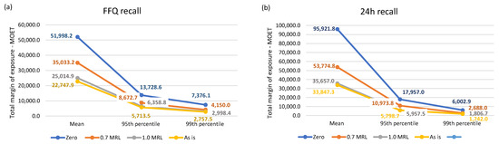 Estimated total margin of exposure (MOET) at average, 95th and 99th percentile for two recall methods: (a) FFQ recall; (b) 24 h recall. MRL—maximum residue level. LOD—limit of detection. Legend: “as is”—all samples; “1.0 MRL”—samples below MRL; “0.7 MRL”—only samples below 0.7 MRL; “zero”—below LOD.