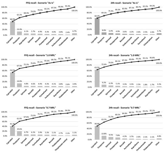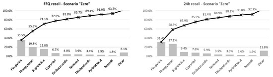 In Figure 2, a Pareto distribution illustrates the primary sources contributing to exposure. In all scenarios with active substances (“as is”, “1.0 MRL” and “0.7 MRL”) and using both recall methods, cyprodinil is the predominant contributor, accounting for 41.3–63.5% of the total depending on the recall methods and scenario. Cyprodinil is mainly associated with green salads and strawberries. Fluopyram follows with a share of 8.8%–19.6%, mainly from blueberries and strawberries. In the “zero” scenario, fluopyram and fluxapyroxad are the main active substances of concern.