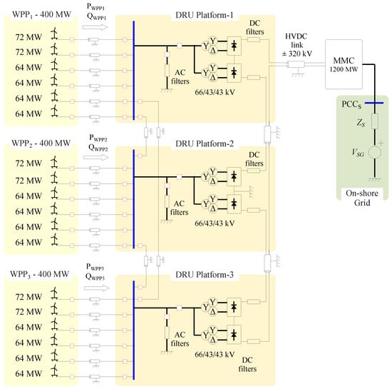 The DR–HVdc system is composed of three DR platforms []. Each platform includes two 12-pulse DR of 200 MW, with a parallel connection on the ac side and a series connection on the dc side.