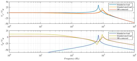 Figure 3 shows the frequency response of each considered operating mode. As Figure 3 shows, both the resonant peak amplitude and frequency depend on the case being considered. Moreover, an anti-resonant peak (at 640 Hz) in the current’s amplitude diagram appears when the system is DR-connected. On the other hand, both resonant and anti-resonant peaks are much smaller when considering islanded operation at rated-load, as the considered resistive load would introduce additional damping.
