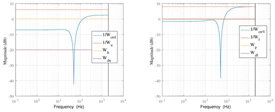 - is the reference weight and includes the added uncertainty to the inductor filter and , considering the system in per-unit values. It is fixed to 1 for the output weights to be interpreted in standard position/tracking errors at given frequencies, as customary in the widely used mixed-sensitivity design [];