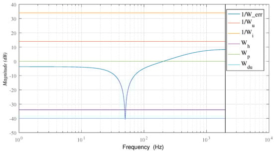- is an input weight at the control action (i.e., at the input of ). Additionally, the robust control methodologies can reduce the steady-state error at the synchronous frequency, placing poles close to the imaginary axis (theory forbids unobservable output weights in the imaginary axis). Additionally, input disturbances at the control action are included to avoid the cancellation issues produced by the cancellation of complex poles close to the imaginary axis. This weight is also constant and is fixed to 0.1;