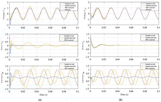 The dynamic response to a sinusoidal reference of all the controllers is reasonable for the islanded no-load condition (this is the plant used for all controller designs). However, the cascaded controllers’ performance shows worse dynamics than the single controller when changing the mode of operation, particularly for the DR-connected case.