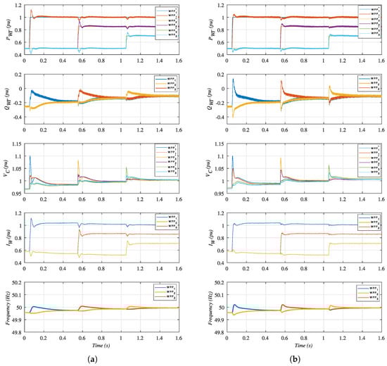 From top to bottom, the first graph in Figure 11 shows the active power delivered by each WPP cluster, together with its reference. The second graph shows the reactive power being delivered by each WPP cluster. The third graph shows the WTG capacitor voltage () and its reference. The fourth graph shows the current magnitude of (), and the frequency of each WPP cluster is shown in the fifth graph.