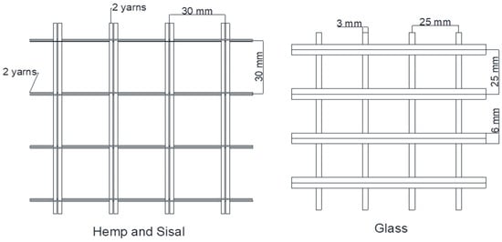 Vegetal fabrics were crafted using hemp and sisal yarns (both with a diameter of 2.5 mm). This arbitrary choice was justified by the notable tension levels achieved by hemp and sisal FRCM specimens in a prior study by Mercedes et al. [18]. In that study, the fabrics and yarns were coated with epoxy resin. This was performed to prevent fiber degradation produced by the environment of cementitious matrix composites (high alkalinity and humidity cycles) (see Ardanuy et al.) [19].