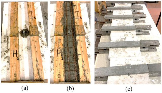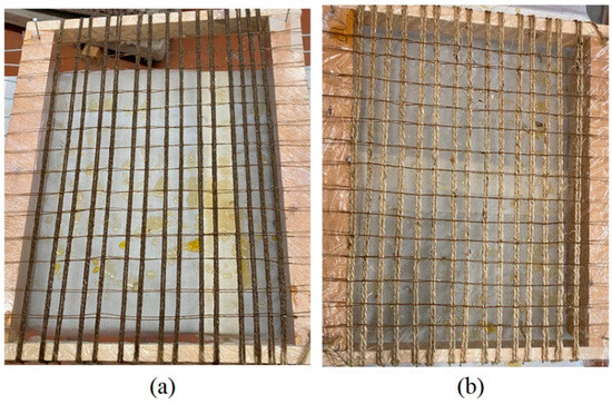 The mold to manufacture the FRCM specimens was prepared with a grid of wooden strips with 50 mm × 400 mm gaps (see Figure 4). These strips had a height of 20 mm. The manufacturing procedure was as follows: