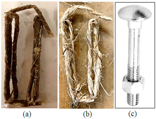 Vegetal fiber connectors were crafted hook-shaped and impregnated with epoxy resin, featuring an equivalent area of 29.43 mm2 (6 yarns). Steel connectors were in the shape of a pin or bolt with a cross-sectional area of 0.79 mm2, accompanied by a nut at one end to enhance the anchoring effect with the mortar (see Figure 3).