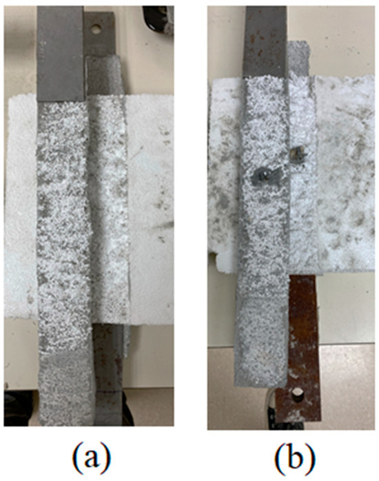 The specimens were subjected to a double-shear test (see Figure 6). In this test, metal plates (similar to those used in tension tests) were bonded to one end of the FRCM on each side of the sandwich specimen. This shear test is an adaptation inspired by the tension test with the clevis system according to AC434-0213-R1 [23]. In this configuration, auxiliary plates of aluminum were attached externally on opposite sides of the load application, simply to prevent the turning of the specimens during the test. An electromechanical press (MTS Insight 10 kN range) was used to perform the tests with a test rate of 2 mm/min.