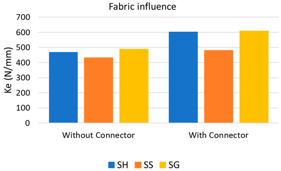 Figure 8 and Figure 9 show the impact of the fabric on the maximum load and elastic stiffness of the specimens. The performance of different fabric types remains consistent for both maximum load and stiffness values, regardless of the presence of connectors. Concerning maximum load, the inclusion of connectors significantly enhances the capacity for vegetal specimens, ranging from 13% to 53%. However, there is no notable change for glass fabric. This suggests that the FRCM skin may not reach the cracking strength required to activate the glass fabric, unlike what occurs with vegetal fabrics. Nevertheless, connectors play a beneficial role in maintaining cohesion between materials, activating vegetal fabrics at the achieved level of strain until significantly producing a higher ultimate load.