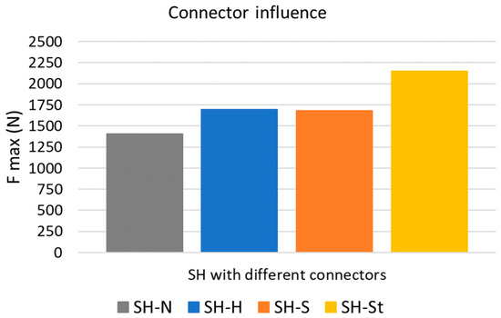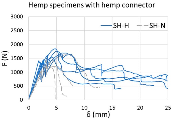 From Table 3 and the plots of Figure 12, Figure 13 and Figure 14, it is feasible to estimate the contribution of the interface of the FRCM and polystyrene. To study the effect of the connector, only hemp FRCM specimens (SH) were used because they contain all type of samples.