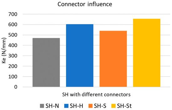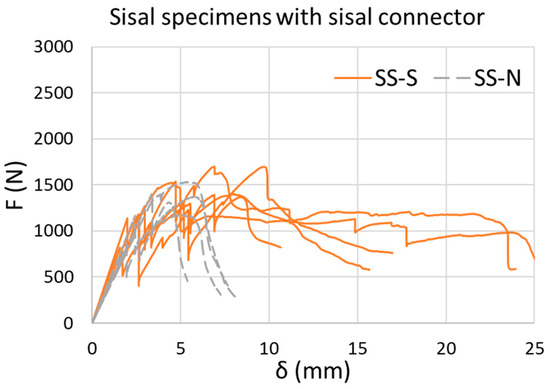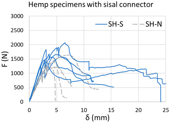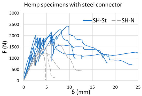 As stated in Figure 11, steel connectors showed the highest stiffness, followed by hemp and finally sisal connectors. This property explains the reason why steel connectors are those that contribute more significantly to the shear strength of the specimen, providing a contribution 165% more than the vegetal connectors. Hemp and sisal show a similar contribution, due to their similar mechanical properties seen in Table 1.