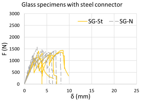 Figure 12, Figure 13, Figure 14, Figure 15 and Figure 16 show the load–displacement plots of the tested panels. It can be seen that specimens without connectors exhibit a quasi-brittle failure with a limited range of deformation (dashed lines) compared to specimens with connectors (continuous line). The presence of connectors enhances the activation of vegetal fabrics, effectively tightening the interfaces between materials and contributing to an increased strength of the sandwich structure. In the case of glass, the levels of strain are low in the FRCM and the fabric is not activated; therefore, there is no large difference in the load–displacement plots.
