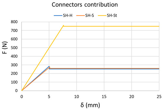The connectors interact, exhibiting a bi-linear behavior. Each one interacts, increasing its contribution until the maximum load is reached, while after, they are capable of maintaining it without a significant reduction, due to its stiffness.