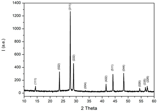 The CsTeMoO6 compound was obtained and described according to previous works [22,23]. The study of the crystal structure, thermal properties and electronic structure showed that it belongs to the β-pyrochlore structure type and has absorption lines inside the band gap (3.1 eV) at ~2 and 2.6 eV, which corresponds to the visible light range. The obtained electron band diagram for CsTeMoO6 has been confirmed by photocatalytic experiments: absorption of photons with an energy of ~2 eV leads to the formation of electron–hole pairs, which lead to oxidation reactions of organic substances, which is shown by the example of the photodecomposition of methylene blue and methyl orange [22]. Figure 1 shows the powder X-ray diffraction pattern of the resulting CsTeMoO6 sample, which can be indexed in the cubic system with the space group [23].