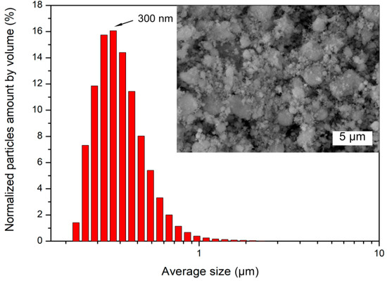 The average particle size of the CsTeMoO6 powder dispersed in a planetary mill was 670 nm, with the maximum particle size distribution at 300 nm (Figure 2). The particle size distribution was unimodal, and the SEM results showed that micron agglomerates of smaller particles predominantly represented the powder.