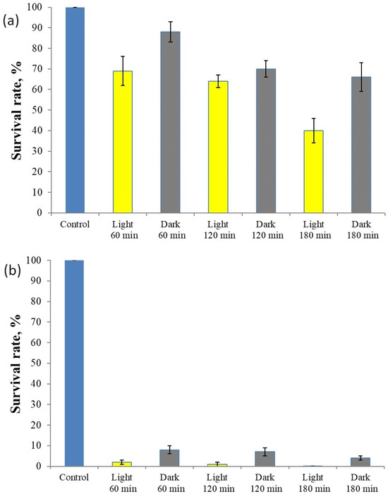 Survival rate of bacteria S. aureus (a) and E. coli (b) in the presence of CsTeMoO6 under dark and visible light of a 50 W light source.