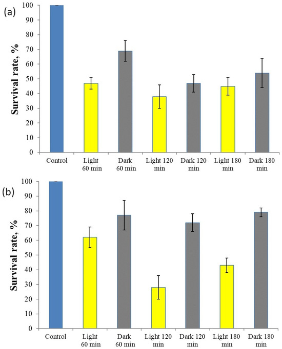 Experimental variants with test compounds were placed in glass bottles with 10 mL of suspension of microorganisms on orbital shakers at 150 rpm, and some of them were exposed to light, while others were kept in darkness. Both bacterial and fungal spore variants were exposed for 60 min, 120 min and 180 min. Controls were used for experiment variants that did not include the test compound.