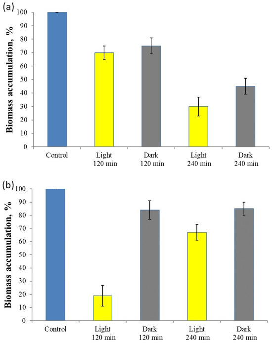 A decrease in fungal biomass accumulation was observed under the action of the test compound in dark and light conditions in the case of experiments with vegetative mycelium (Figure 5).