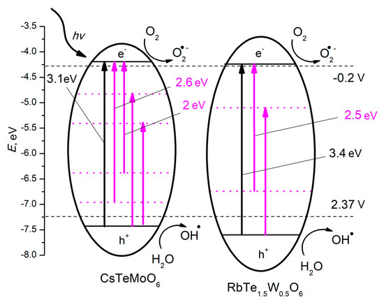 Figure 6 illustrates the mutual arrangement of the electronic levels of the CsTeMoO6 and RbTe1.5W0.5O6 compounds relative to the main redox potentials of water •O2−/O2 (−0.2 V) and •OH/H2O (2.37 V) [36]. Both complex oxides can form simultaneously hydroxyl and superoxide radicals upon absorption of visible light. Possible chemical reactions on the surface of CsTeMoO6 under visible light will be similar to RbTe1.5W0.5O6 and they can be written as: