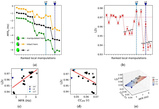 Impact of local manipulations on whole-brain spontaneous activity. (a) Mean firing rate difference (MFRΔ, see Methods) for each silencing condition of the manipulated hemisphere (green), the intact one (yellow), and overall nodes (black). Note that the ranking (i.e., ranked local manipulations, see Table 2) is based on the black curve. (b) The Lempel–Ziv complexity (LZc) metric is reported versus the same ranked local manipulations. The red horizontal lines mark the average value of LZc in the control condition. Error bars represent one standard deviation and asterisks indicate a statistically significant difference from the control condition (* p < 0.05, ** p < 0.01, *** p < 0.001; Kruskal–Wallis and Dunn post hoc test with Benjamini–Hochberg correction). (c) Linear regressions relating the mean firing rate of all nodes (MFR) to LZc (r = 0.69; p = 0.0005). (d) Linear regression relating the averaged pairwise cross-correlation (CCIFR) to LZc (r = −0.55, p = 0.009). (e) Multivariate regression of LZc with respect to the independent variables MFR and CCIFR (R2 = 0.98, R2adjusted = 0.98, p = 2 × 10−16).
