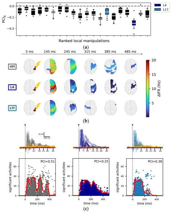 Specifically, the spatiotemporal distribution of the significant activities (see Methods) elicited by the stimulation pulse in the control and in the two representative manipulations displayed marked differences (Figure 3b). In particular, compared to the control condition, in the case of L4 silencing, the response was sustained in time but spatially redundant (i.e., the significant activities often involved the same areas), and it did not involve the non-stimulated hemisphere as confirmed by the <ΔIFR> temporal profile (Figure 3c top panel). On the other hand, in the case L17 silencing, significant evoked activity extended to the non-stimulated hemisphere (Figure 3c top panel) but was short-lived. The richness of the significant spatial-temporal patterns evoked by a stimulus can also be described by the SS matrices (see Methods, Figure 3c bottom panels). Compared to the control condition, the SS matrix of both L4 and L17 were either restricted in space (i.e., evoked activity remained more local, as in L4) or in time (i.e., the significant evoked activity decayed rapidly, as in L17). Interestingly, in L4, the significant activity described by the source entropy (Hsrc) was comparable to the control (0.79 ± 0.03 and 0.79 ± 0.02, respectively), but the evoked activity was more redundant in time (compare Figure 3a), confirming the dissociations between PCI and Hsrc (Supplementary Results, Section S2, Figure S3) also found in empirical studies [17]. Consistent with these observations, we found a significant reduction of PCI (p < 0.00001, ANOVA and post hoc pairwise T t-test with Benjamini–Hochberg correction) for both L4 and L17 (Figure S2, grey arrows. Control: 0.49 ± 0.03; L4: 0.25 ± 0.01; L17: 0.37 ± 0.04).