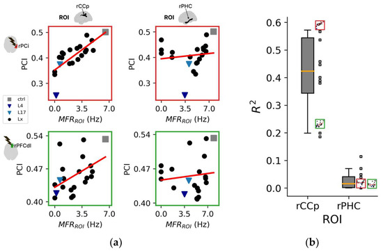 By taking advantage of the systematic and extensive investigation of stimulation/silencing pairs, we further explored the variability of the impact of local silencing on both spontaneous and evoked metrics and investigated the contribution of individual region activity (i.e., MFR) to PCI across all conditions. Thus, for each stimulation, we performed a linear regression of the PCI values (i.e., mean across resamples) versus the spontaneous mean firing rate of a node/region of interest (MFRROI) across all conditions (including the control condition and all local manipulations). Figure 4a shows the linear regressions for two representative ROIs (right posterior cingulate cortex; rCCp and right parahippocampal cortex; rPHC), corresponding to the ROIs showing the third highest and third lowest average correlations across stimuli, respectively. For each of the two ROIs, we show two representative stimulations delivered to the inferior parietal cortex (PCi; R2 = 0.59, p = 5 × 10−5 and R2 = 0.02, p = 0.58) and the dorsolateral prefrontal cortex (PFCdl; R2 = 0.23, p = 0.03 and R2 = 0.01, p = 0.60). We found that PCI correlated well with MFRROI (CCp) for most stimulations (F-statistic of R2, 11 with p < 0.05, one with p = 0.051), ranging from 0.19 to 0.59 (0.41 ± 0.14) (Figure 4b). On the other hand, MFRROI (PHC) was always non-significantly correlated with PCI across the 12 stimulations (p > 0.05).