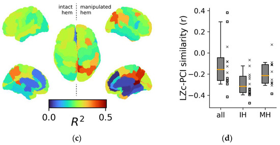 We performed separate linear regressions for MFRROI versus LZc (Figure S6A,B) and computed the similarity between the R2 topography maps of these and the 12 R2 PCI topographies for each stimulation (Figure 4d). We found that the correlations between PCI and LZ topographies were anti-correlated (−0.1 ± 0.23), though many correlations were not significant (5 out of 12). Similar results were obtained when restricting the analysis to either the intact or the manipulated hemisphere (−0.29 ± 0.11 and −0.19 ± 0.12, respectively).