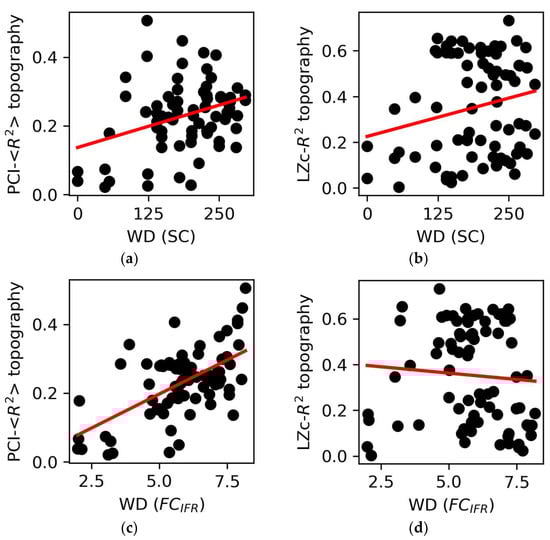 We explored the relationship between the R2-topographies derived from spontaneous (LZc) as well as perturbational complexity (PCI) measures and basic graph properties. To this aim, we correlated the weighted degree (WD) of each node (an index of network centrality calculated both on SC and FC) with the corresponding values of the complexity-R2 topographies (Figure 5). The WD computed on the SC showed a weak, albeit significant, correlation with the PCI average-R2 topography across the 12 stimulations (r = 0.34, p = 0.0026; Figure 5a). Conversely, we did not find a significant correlation with the LZc-R2 topography (p = 0.063, Figure 5b). Similarly, we found a significant correlation between the WD computed on the SC and the PCI-R2 topography applied to Hconn (r = 0.44, p = 2∙10−49; Figure S7A). Further, we found even more robust correlations between WD calculated on FC and the average PCI-R2 topography (r = 0.6, p = 10−8, Figure 5c). Again, no significant relationship was found between WD and the LZc-R2 topography (p = 0.5, Figure 5d). Similar results (Figure S7B–E) were obtained when using WD calculated on the FC derived from BOLD signals (FCBOLD; see Section 2).