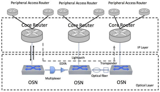 IP over WDM networks consists of two layers: the IP layer and the optical layer, as shown in Figure 1. IP routers are responsible for routing at the IP layer, receiving aggregated traffic from peripheral routers, and interconnecting with the optical side of the network. The optical layer serves as the provider layer, offering services to the client layer through lightpaths. They consist of optical cross-connects (OXC), transponders, optical amplifiers, and multiplexers/demultiplexers [9]. The optical cross-connects (OXC) provide switching of optical signals between input and output ports. They can capture a snapshot of lightpaths and deactivate the paths dynamically. They can also support lightpath management and protection functions. They may also include wavelength conversion, multiplexing, and grooming capabilities internally [10]. Transponders are used when the format of the optical signal from the IP router needs to be adapted to another format. The transponder on the client side receives the signal from the IP router, converts it into an electronic signal, and then converts it back to the required WDM wavelength. The reverse procedure takes place on the receiving side of the network. This operation is called optical–electrical–optical (OEO) conversion. Optical amplifiers (EDFA) directly amplify optical signals without the need for converting them into electrical signals. They are placed along the fiber at intervals to compensate for the attenuation of the fiber. They are also used as amplifiers to increase the transmitting power of the transmitter or as pre-amplifiers to improve the sensitivity of the receiver [10]. Multiplexers and demultiplexers combine and separate multiple wavelengths carried through the fiber [10].
