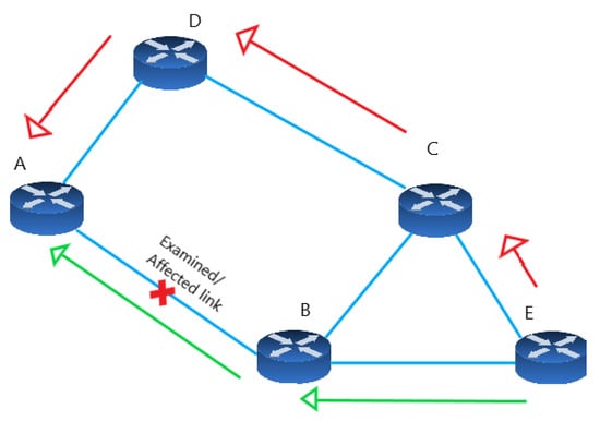 The network paths that may be present in the area that will suffer a catastrophic earthquake, as can be seen in Figure 2, are the A-B, B-A, A-B-E, and E-B-A paths. The appropriate optimal backup paths for this case are the A-D-C-B, B-C-D-A, A-D-C-E, and E-C-D-A paths.