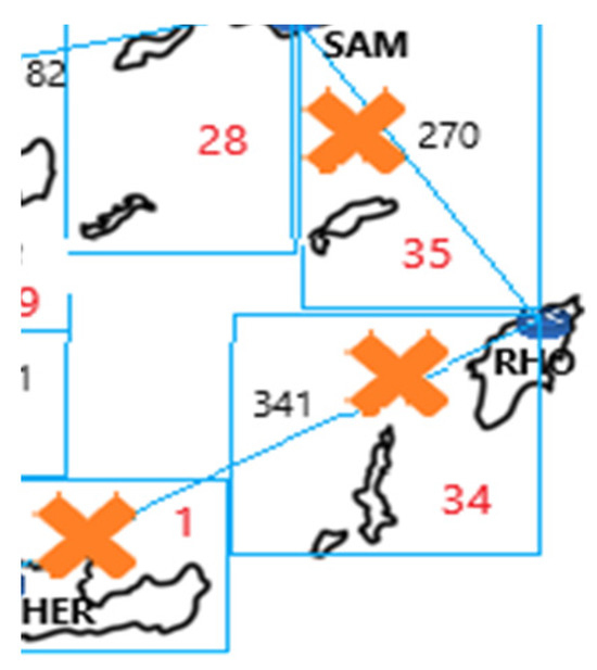 For example, when two neighboring regions are potential candidates for catastrophic earthquakes, and the only way to access a node in the network is through links passing through these regions, none of these links can be categorized as critical. Removing any of these links would render the node unreachable. This can be seen in Figure 4, where there are three affected regions: 35, 34, and 1, and the affected links are 270 and 341. Neither of them can be characterized as critical because removing any of those links immediately sets the RHO node as inaccessible.
