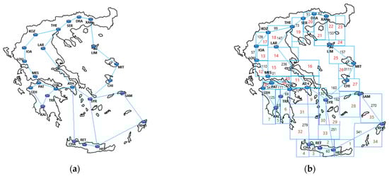 On the map of Figure 5a, the letter code beside every node signifies the name of the town or island and is utilized to identify each individual node on the map. On the second map, depicted in Figure 5b, the numbers displayed next to each link represent the distance between two nodes that each link is spanning through. Additionally, Figure 5b shows the geographical regions used in the simulation, with each region specified with a unique number code in red.